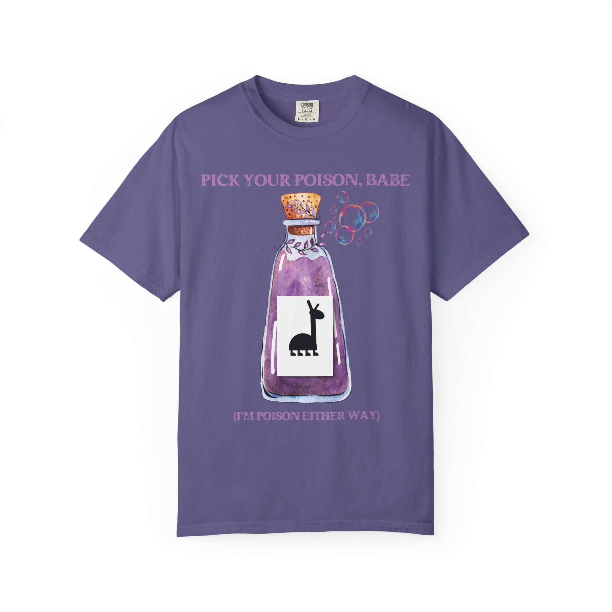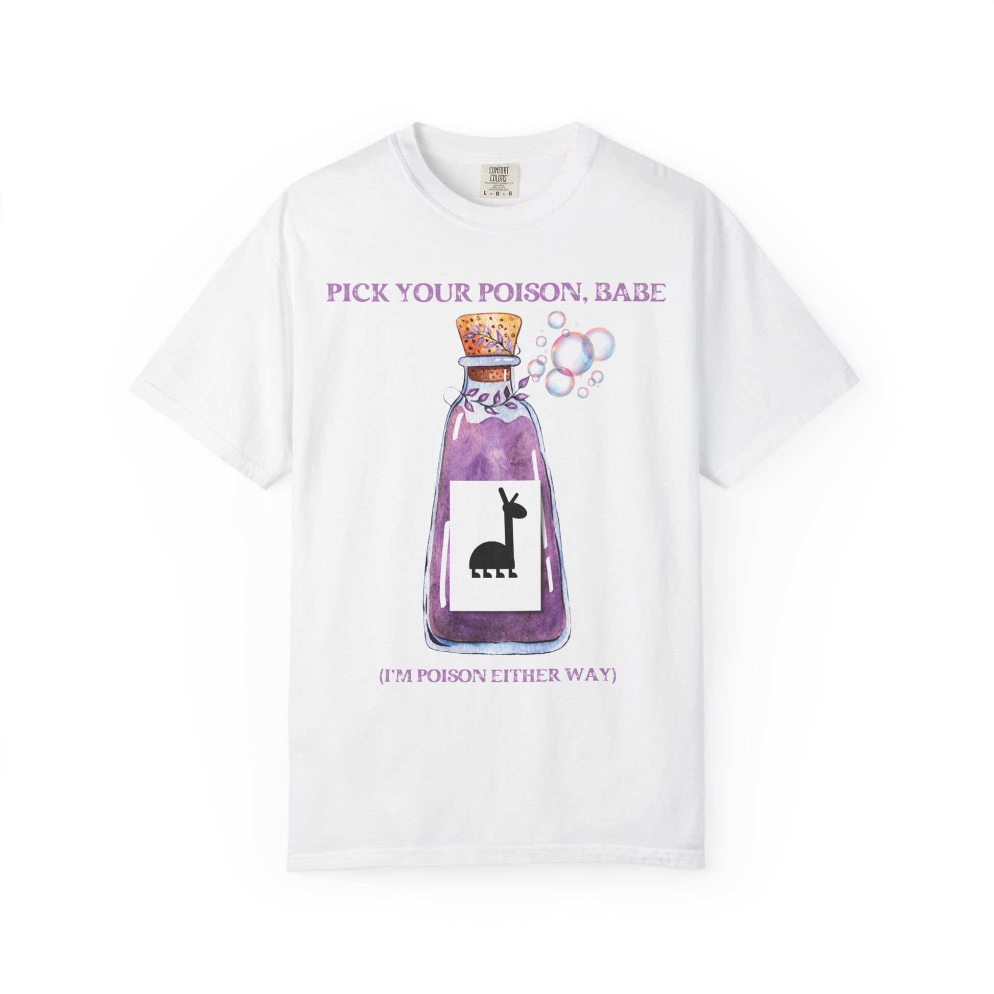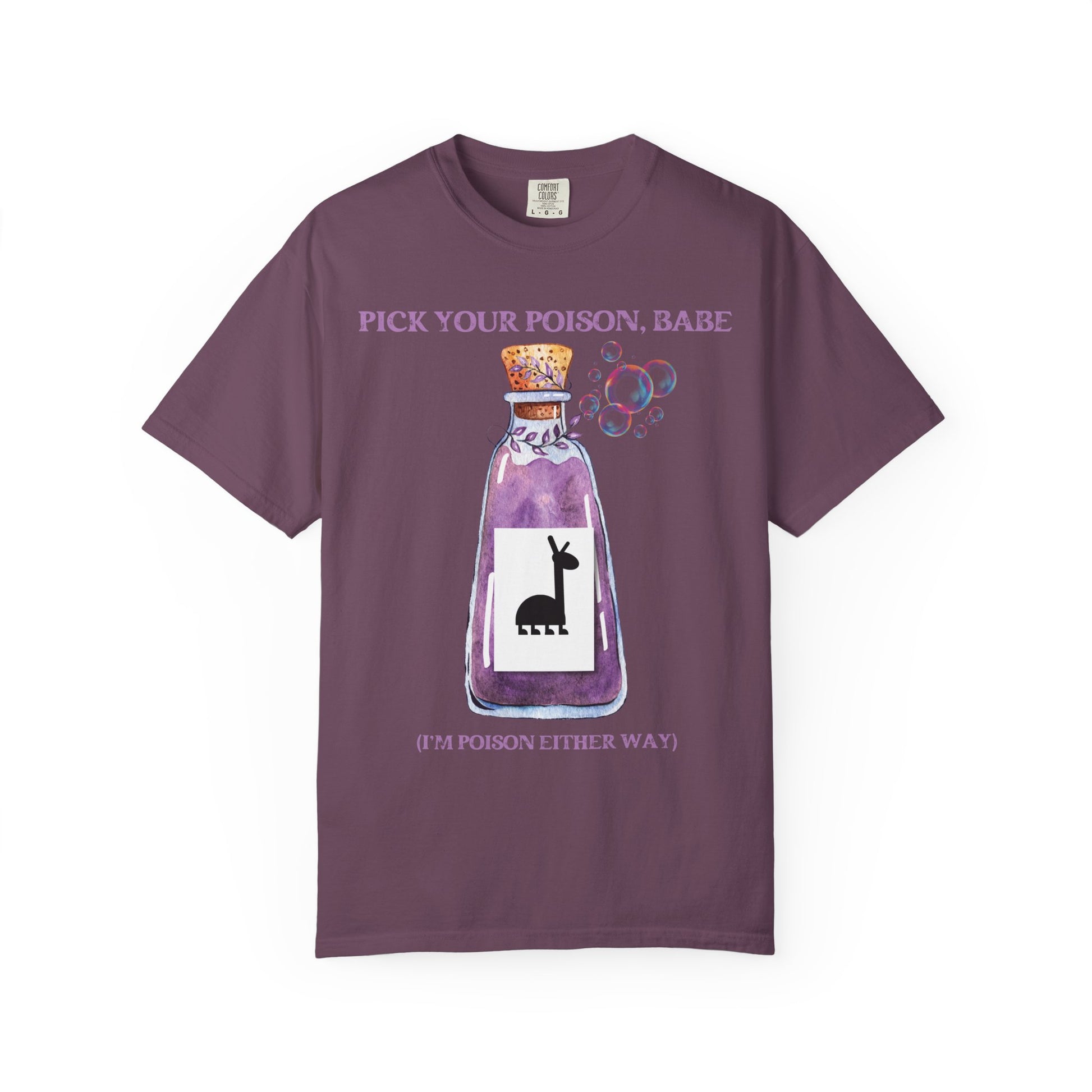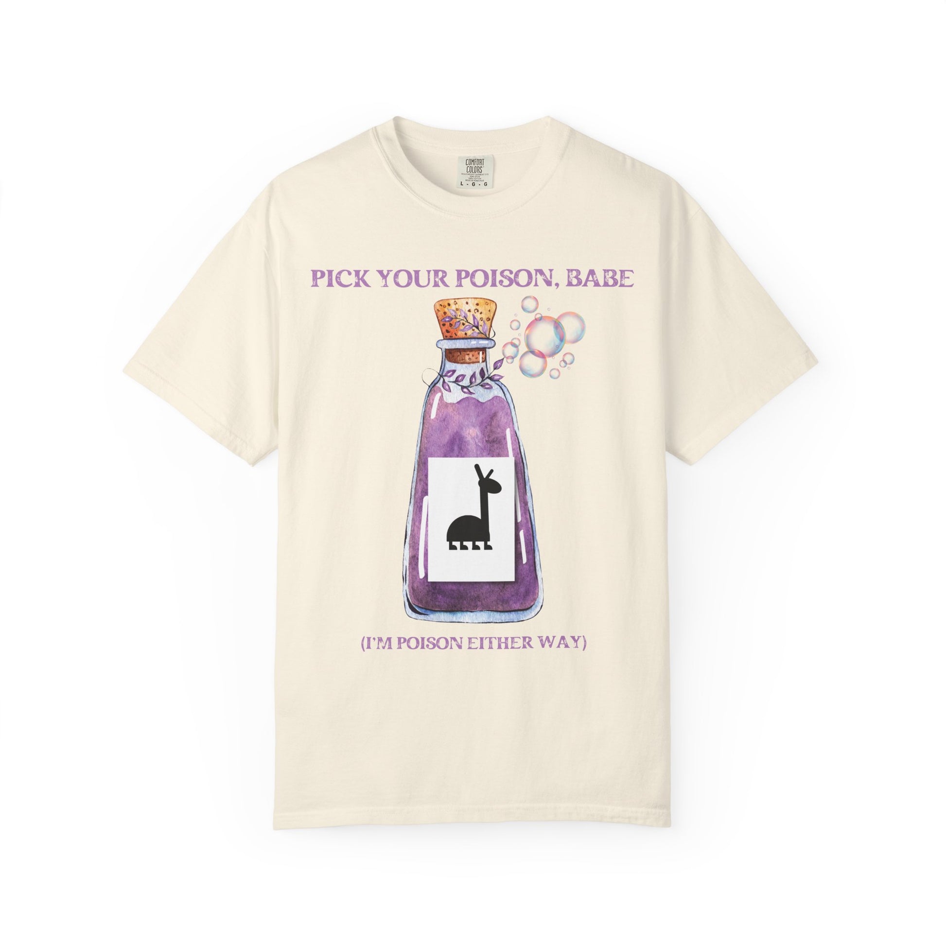 Channel your inner villain with this wickedly fun “Pick Your Poison Babe, I'm Poison Either Way” tee. Featuring a quirky llama poison bottle graphic, this shirt perfectly captures Yzma’s sass and mischief with a modern, edgy twist.