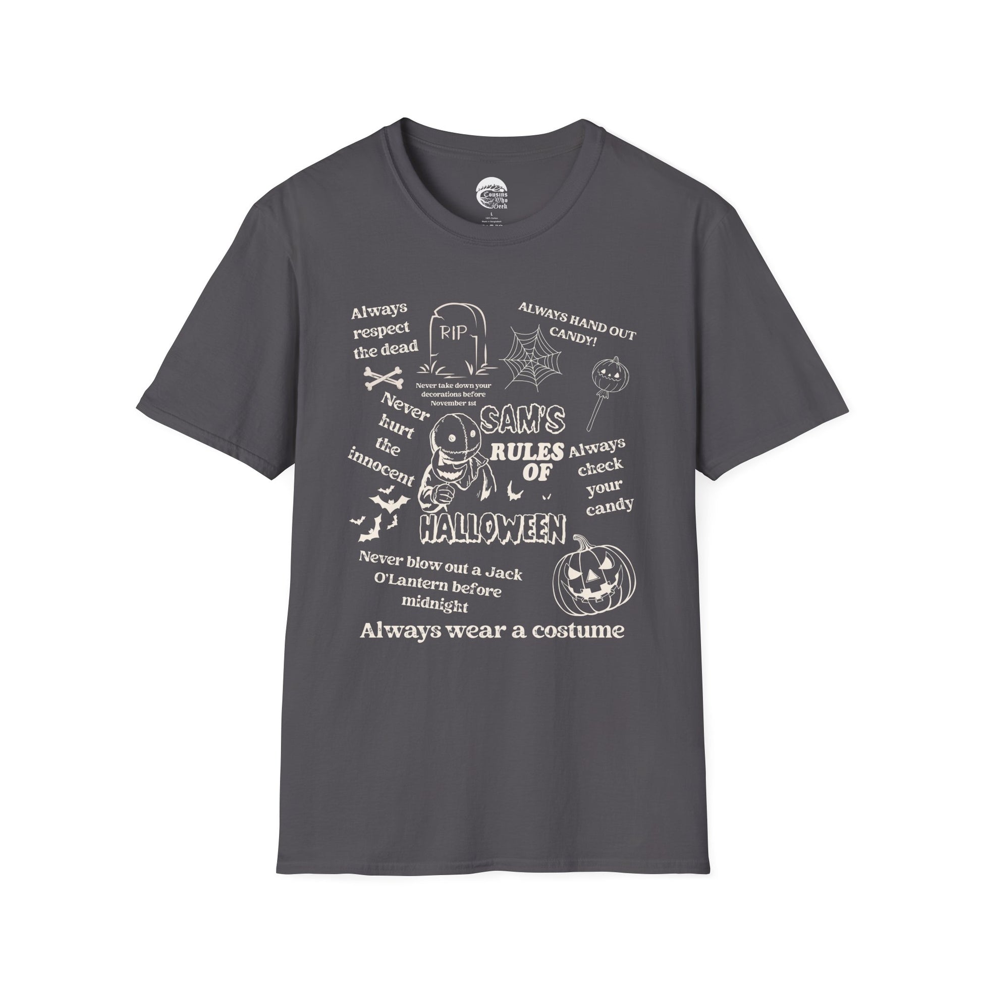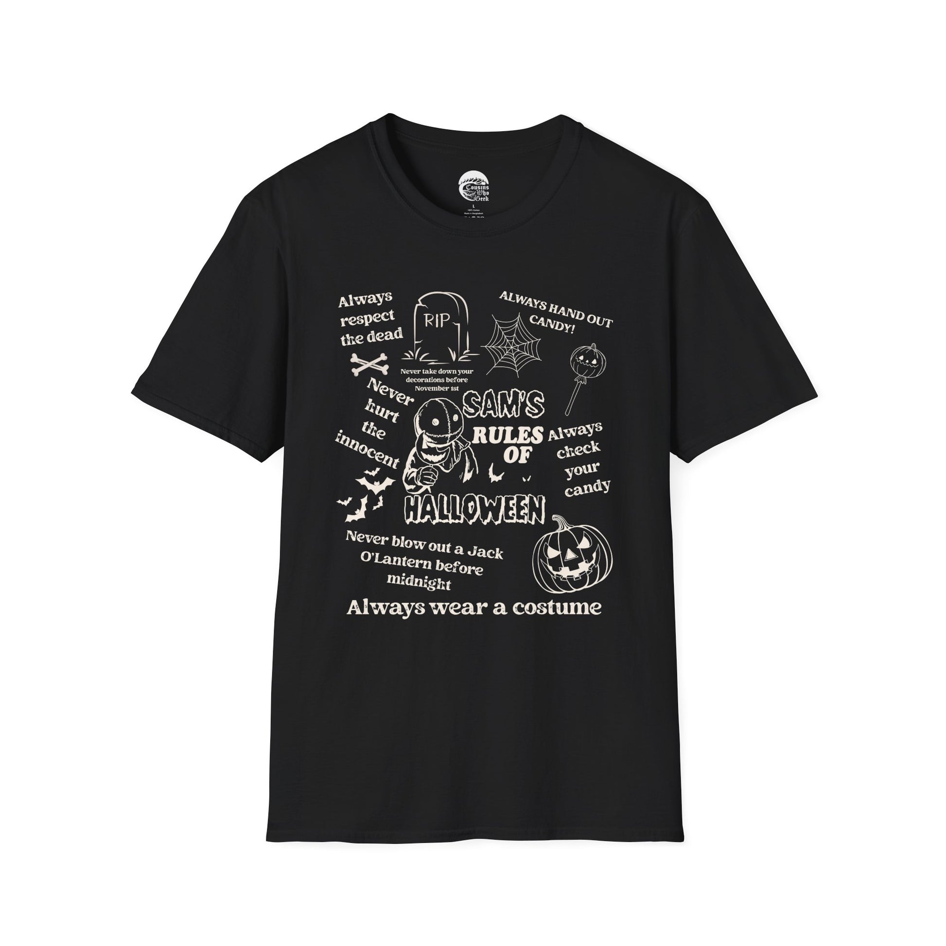 Celebrate the spooky spirit of Halloween with this chilling “Sam’s Rules for Halloween” tee, inspired by the cult classic Trick ‘r Treat. Featuring Sam’s iconic list of rules, this shirt is perfect for those who live for the thrills, chills, and traditions of the season. Whether you’re trick-or-treating, haunting parties, or just embracing your inner Sam, this tee brings Halloween vibes year-round.