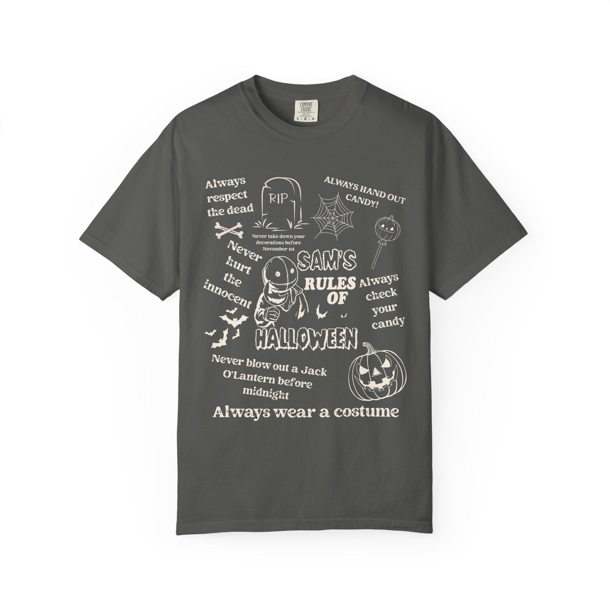 Celebrate the spooky spirit of Halloween with this chilling “Sam’s Rules for Halloween” tee, inspired by the cult classic Trick ‘r Treat. Featuring Sam’s iconic list of rules, this shirt is perfect for those who live for the thrills, chills, and traditions of the season. Whether you’re trick-or-treating, haunting parties, or just embracing your inner Sam, this tee brings Halloween vibes year-round.